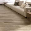 Descubre el porcelanato efecto madera taupe. Su diseño de 23x120cm imita vetas y nudos naturales, brindando calidez a tu espacio.